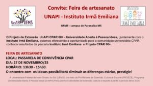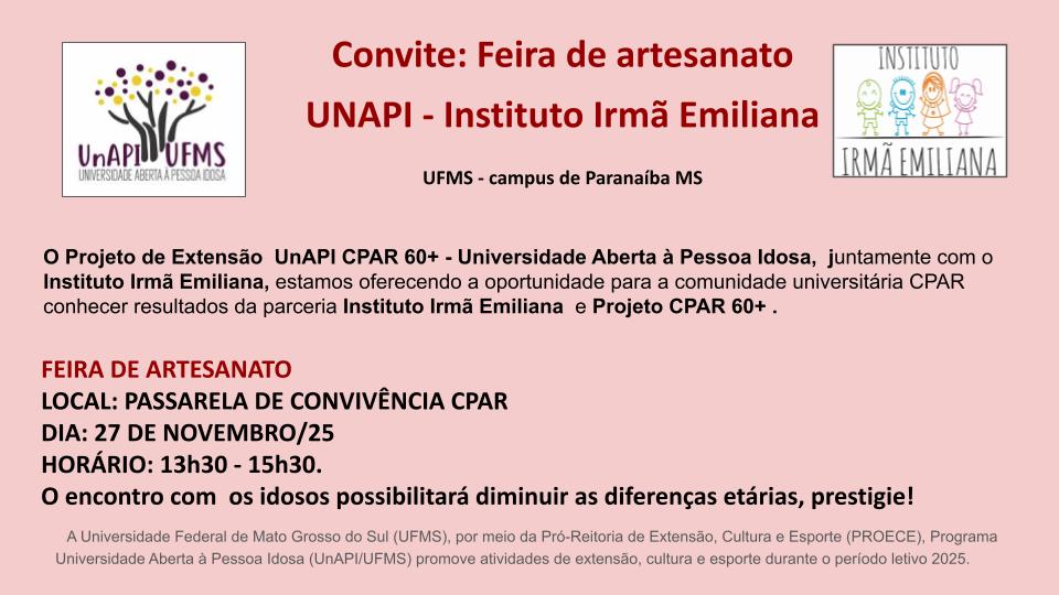 O Projeto de extensão CPAR 60+: Alfabetização Digital e Autonomia Tecnológica (Projeto UNAPI) convida a comunidade universitária para prestigiar a feira de artesanato das artesãs do Instituto Irmã Emiliana.