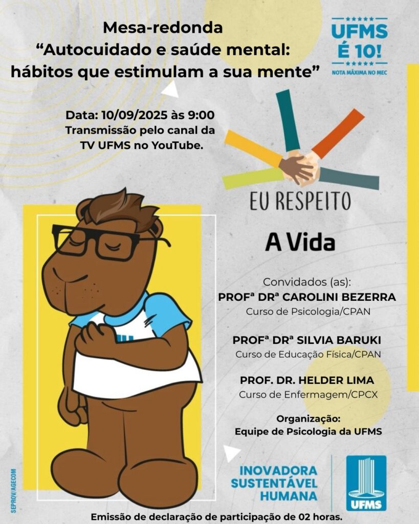 No dia 10 de setembro, a UFMS vai promover uma mesa-redonda com o tema: Autocuidado e saúde mental: hábitos que estimulam sua mente.