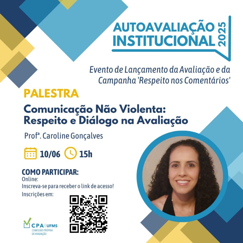 Esta palestra tem como objetivo principal oferecer a toda a nossa comunidade – estudantes (graduação e pós-graduação), professores, técnicos administrativos, coordenadores de curso e diretores – ferramentas valiosas para aprimorar a forma como nos comunicamos. Para refletirmos em como expressar ideias, sugestões e demandas de maneira clara, empática e construtiva, tornando seu feedback um verdadeiro agente de transformação para a UFMS. Compreender e praticar a Comunicação Não Violenta é essencial para um diálogo produtivo na avaliação e em todos os nossos relacionamentos.