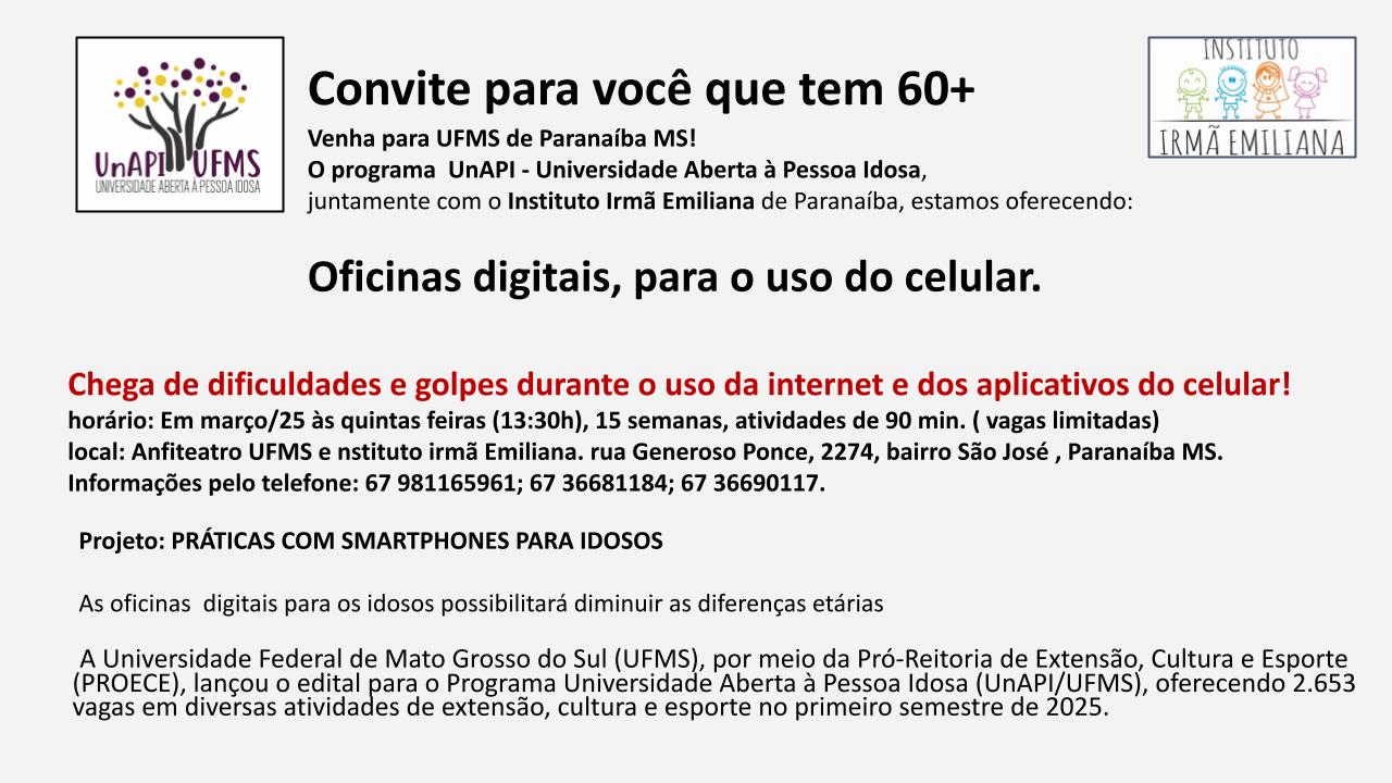 A professora Dra. Silvia Bonassi, do curso de psicologia, e o professor Dr. Raildo Santos Lima, do curso de matemática, ambos do CPAR, organizaram o primeiro encontro do projeto de extensão de Inclusão Digital por meio de Práticas com Smarthphones. O projeto é vinculado à UnAPI (Universidade Aberta à Pessoa Idosa). O encontro aconteceu no Instituto Irmã Emiliana. Também serão desenvolvidas atividades no CPAR.