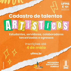 Pela primeira vez, a UFMS abre cadastro para membros da comunidade universitária interessados em expor suas produções artísticas. As apresentações serão em eventos promovidos pela Universidade em todos os câmpus. As inscrições vão até 4 de maio e devem ser feitas no formulário disponível na página da Pró-Reitoria de Extensão, Cultura e Esporte (Proece).